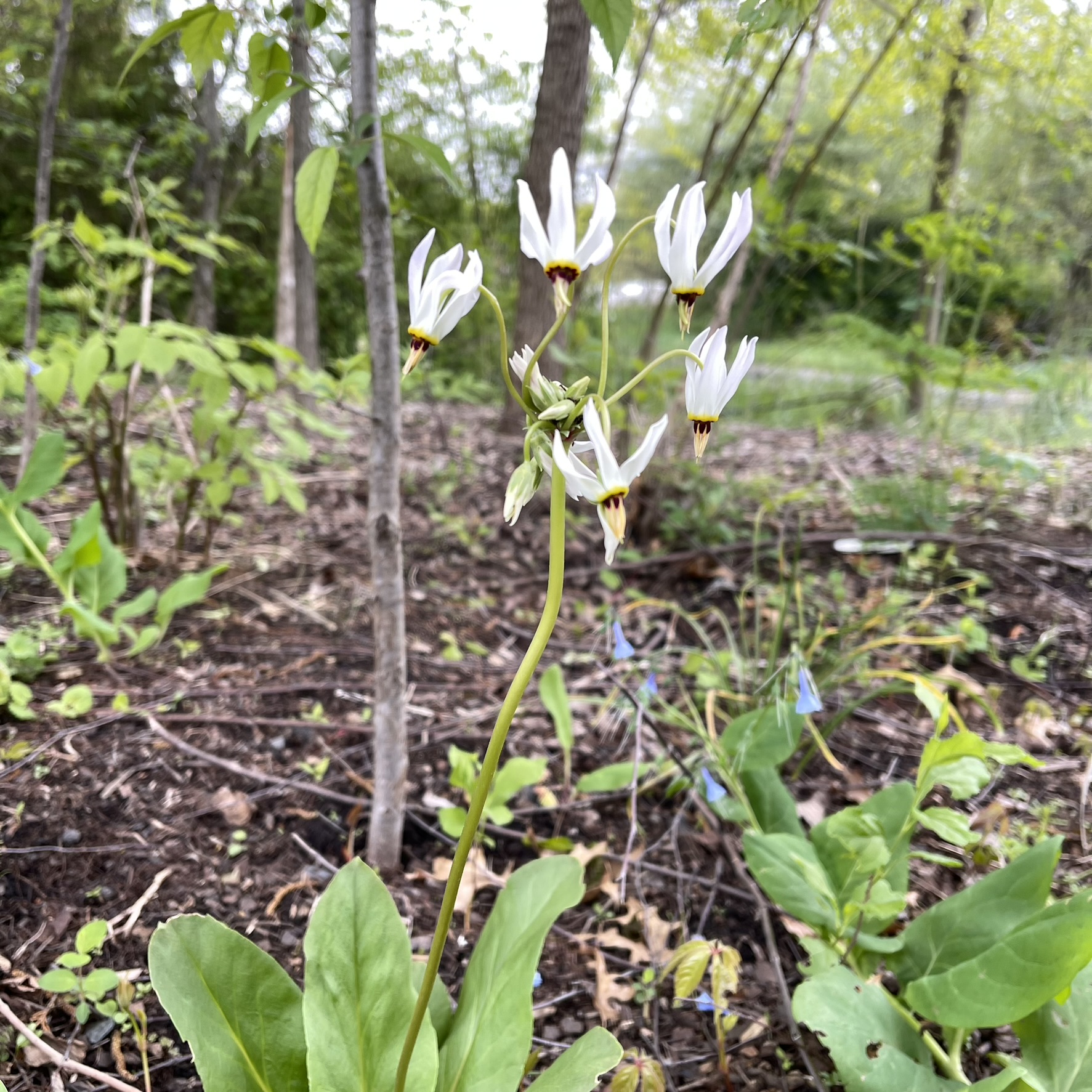 Shooting Star is showy woodland wildflower. Come upon her unexpectedly on your way through the woods, and the experience will be breath taking. Dodecatheon is diminutive in size but the bursting flowers with their reflexed petals are stars of any spring shade garden. Native spring pollinators appreciate the pollen. Dodecatheon is ephemeral so foliage disappears by summer, dormant until next spring.Beautiful seed pods stand tall in fall.