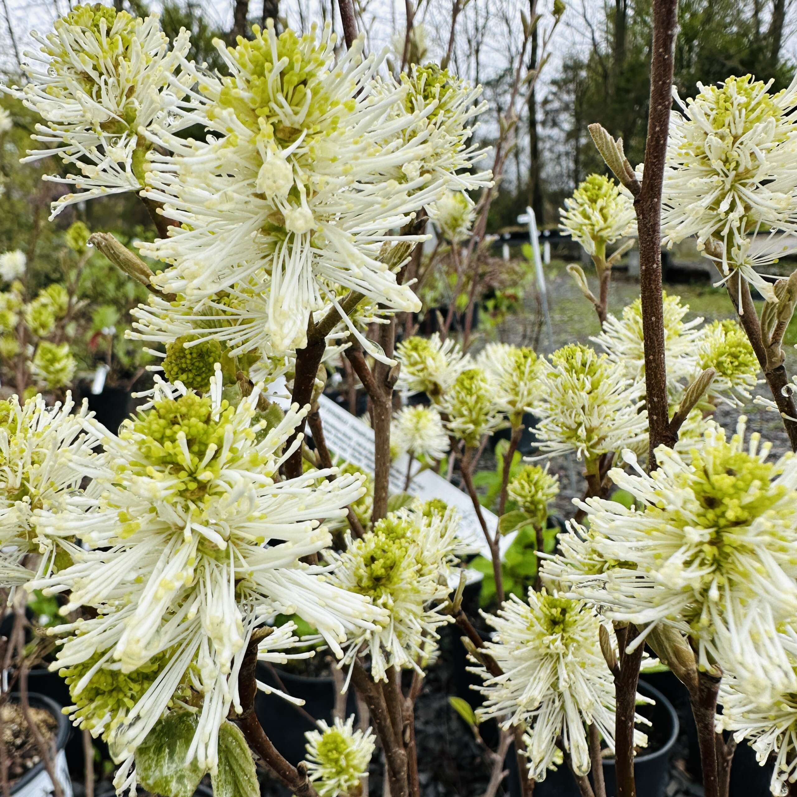 Fothergilla grows in full sun to part shade in moist well drained soils. This beautiful upright multistem rounded shrub can spread by suckers. Fragrant white bottlebrush flowers bloom in spring before the lovely blue green scalloped foliage emerges. Early season native pollinators enjoy the floral nectar reward. Foliage turns striking warm