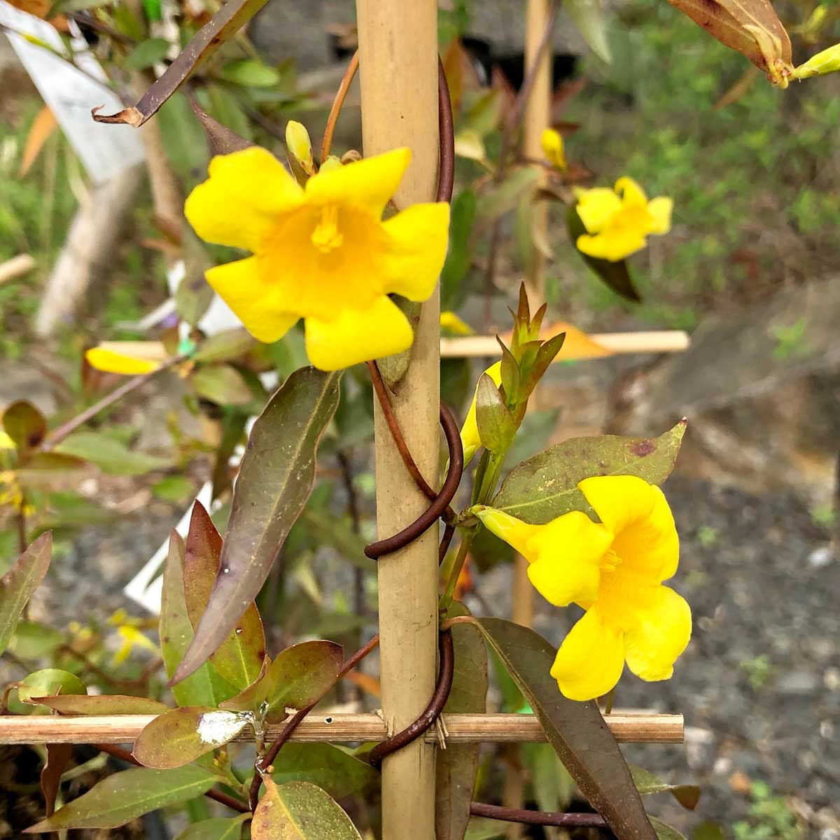 Gelsemium provides a generous, fragrant show of sunny golden yellow blooms in springtime. The glossy dark green foliage is semi-evergreen. A wonderful twining vine, if unsupported Carolina Jessamine makes a bushy groundcover. This native vine attracts bees, butterflies, and hummingbirds, but can be toxic to mammals.