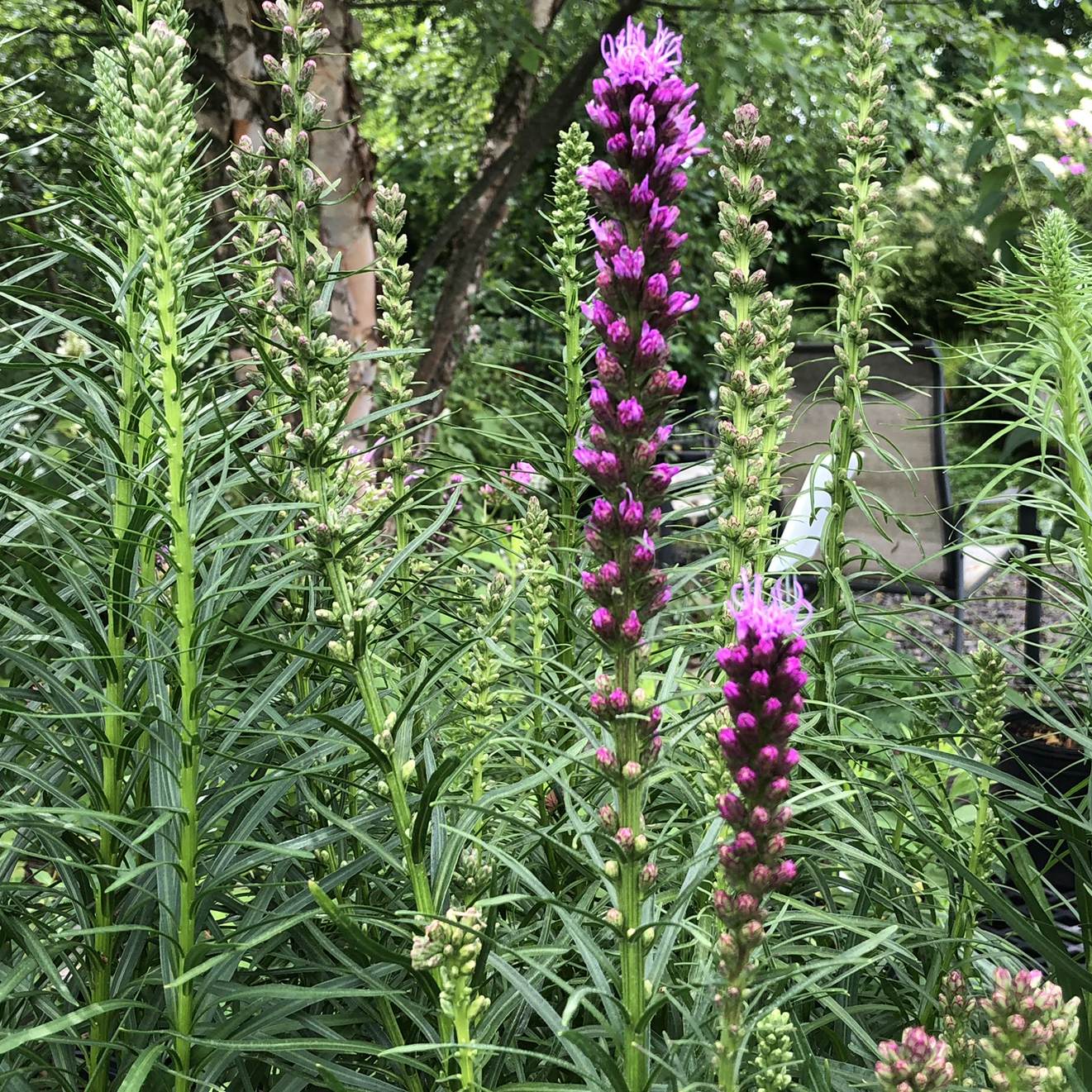 This compact Liatris boasts spikes of rosy purple flowers in summer amidst lovely textural grass like foliage. Kobold likes full sun and average to moist soil and many butterflies, hummingbirds, and pollinators enjoy the long lasting blooms. Later in the year birds eat the fluffy seed heads.
