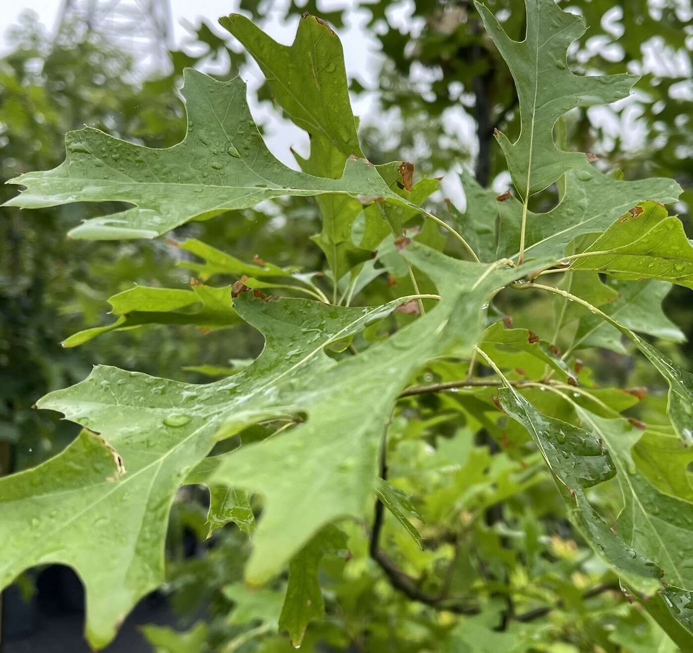 Pin Oak has been widely planted as a street and landscape tree. Naturally growing in floodplains and bottomlands, Quercus palustris appreciates but does not require moist conditions. This native oak has a rounded crown, the bottom branches point downward, and has red to burgundy fall color. Oak trees support 519 species of butterflies and moths in our area.
